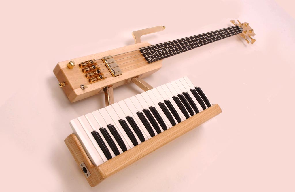 An example of custom engineering would be the Bass Skitz (a.k.a. Schizotron) designed by Guess Musical Instruments. The Schizotron is a bass guitar with a keyboard attached. WindWorks Design designed and built the custom midi electronics embedded into this unique patented instrument. When the player switches into neck/enable mode the bass neck becomes a one handed midi controller, with each note producing a midi signal. The player is able to finger midi bass notes with the left hand while playing chords on the keyboard with the right hand. This is not a typical midi-guitar system, but a unique patented design powered by custom midi electronics designed and built by WindWorks Design.