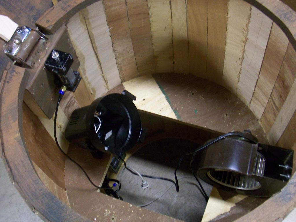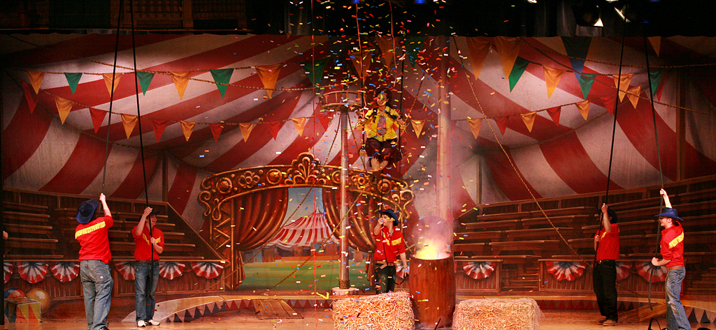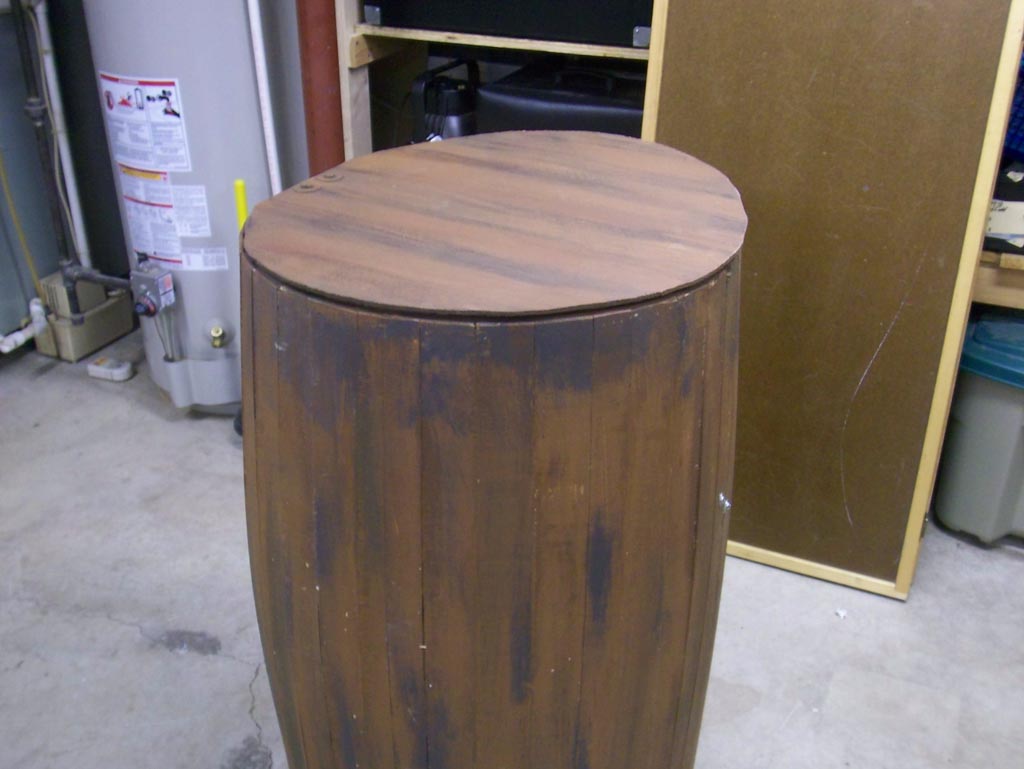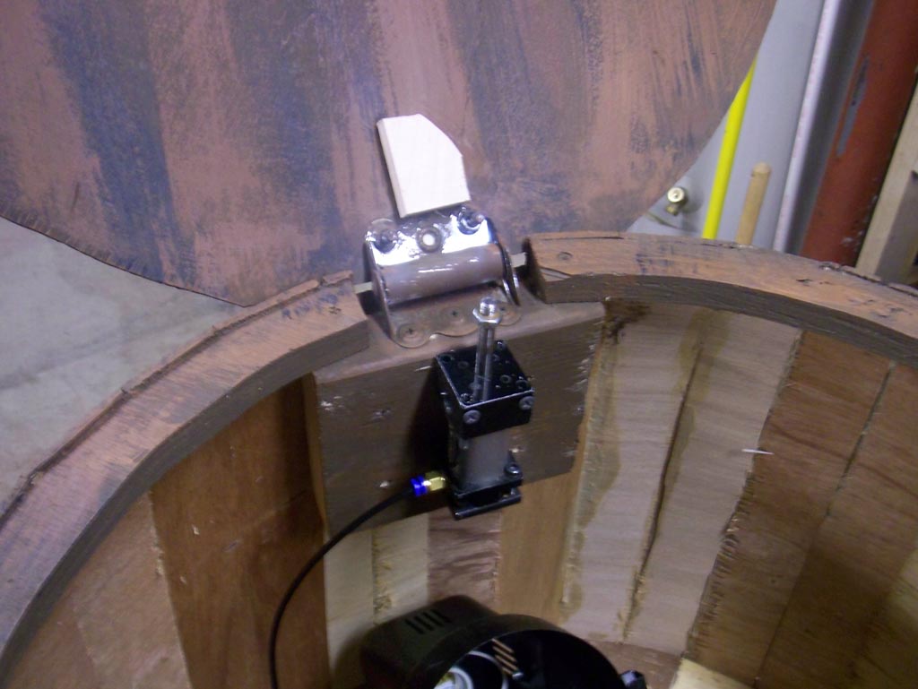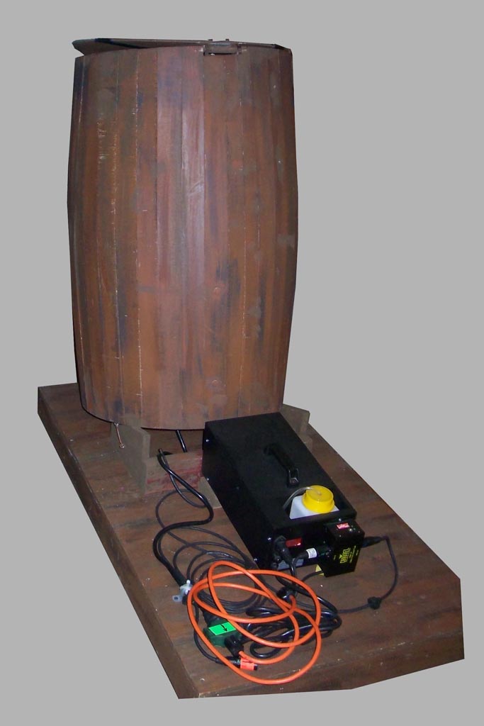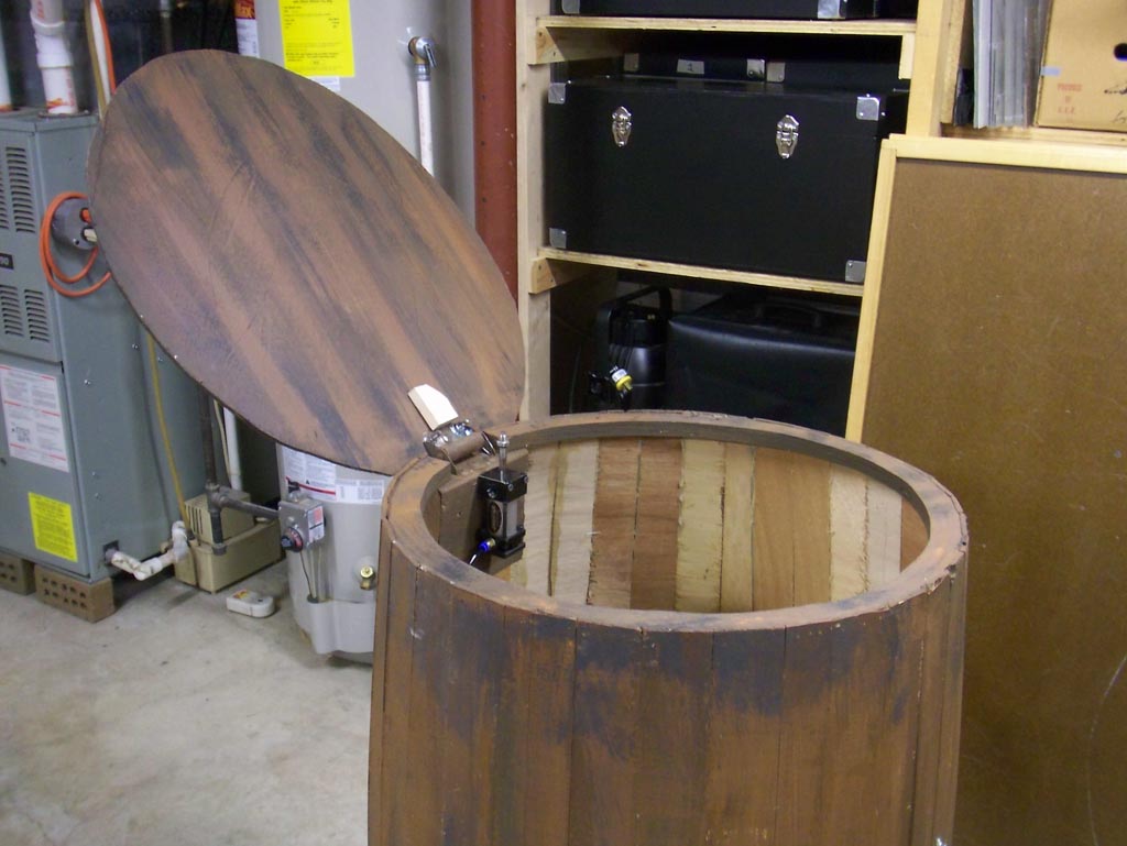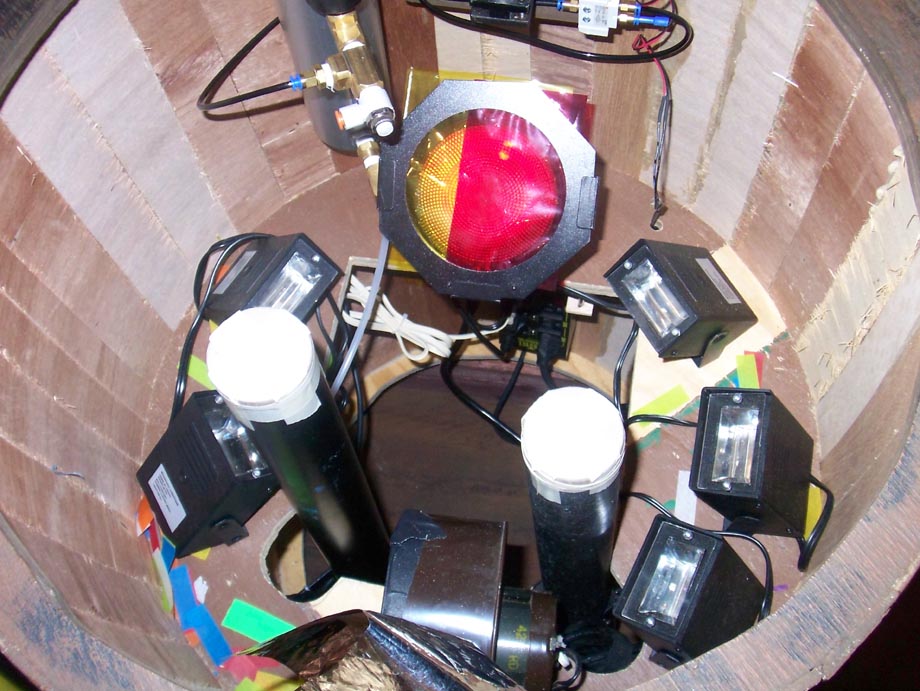 For the play "Annie Get Your Gun", WindWorks Design was contracted to design and build an exploding barrel that would provide an amusing and interesting explosion effect for each performance. Triggered via 4 independent channels of DMX, this barrel first opened its lid via pneumatic cylinder, triggered a fogger, lights, a fan and two independent confetti cannons. The entire barrel was built onto a rolling cart. Inside the barrel was a DMX relay pack, compressed air storage tank, compressed air relay, 6 pneumatic cylinder, spring hinge on the lid, 5 mini-strobes, one dual-gelled par fixture, blower fan with silver Mylar fluttering strands, and two electrically triggered confetti cannons. Before each performance, the compressed air storage tank was filled to 80PSI and the fogger was pre-heated. When wheeled on stage, it was connected to the main DMX universe where it was triggered via programming in the main lighting console.